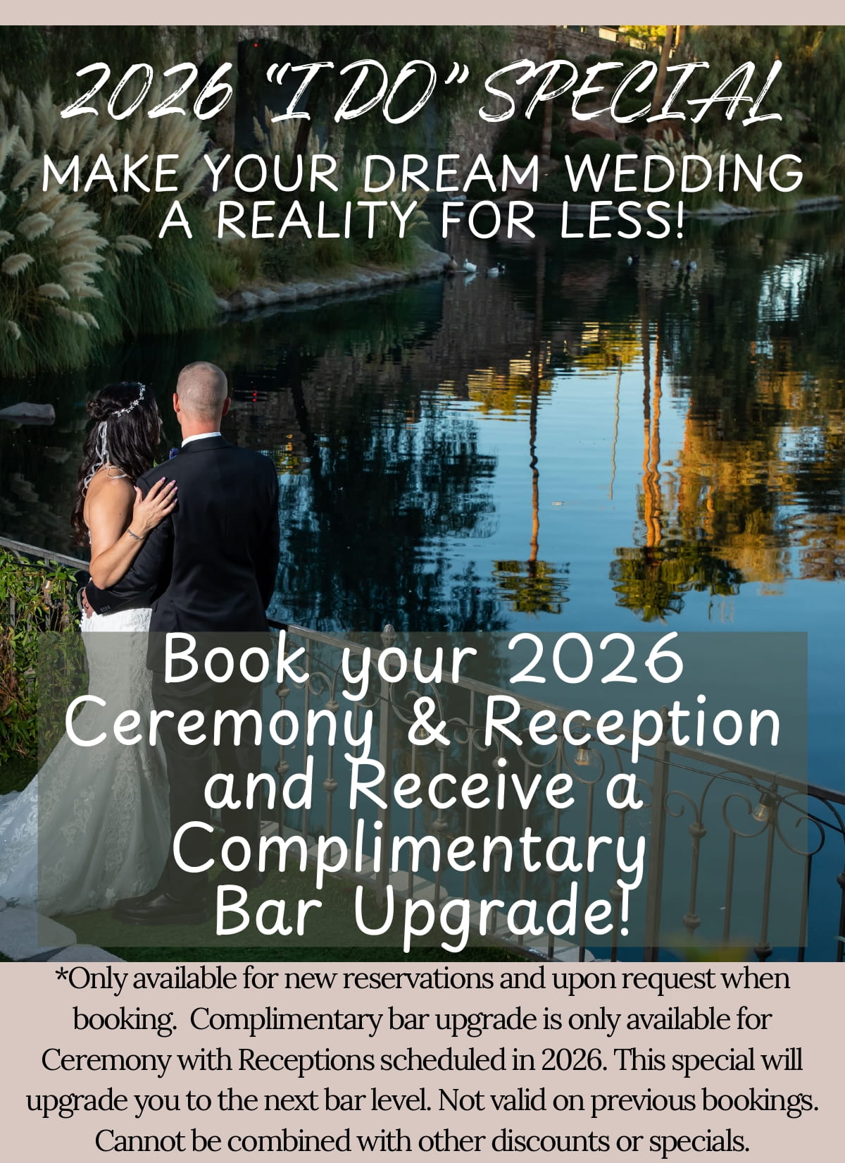 Say your “I DOs” amidst the gentle sounds of a tranquil 6-foot waterfall, creating a romantic and enchanting backdrop for your all-inclusive Las Vegas wedding package